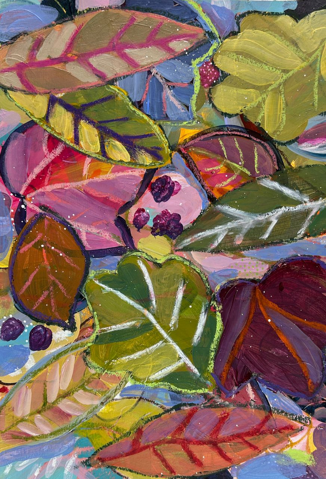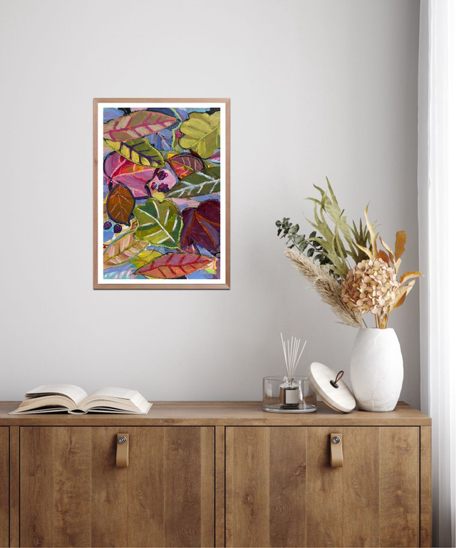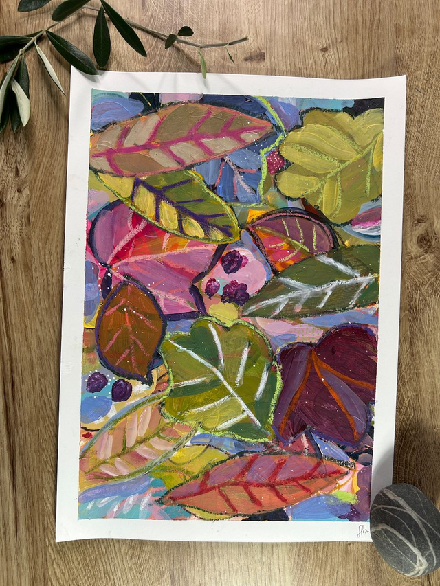 Une peinture comme un tapis de feuilles, qui viendra apporter ses touches subtiles sur vos murs. Violet, vert, rose et une touche de bleu.